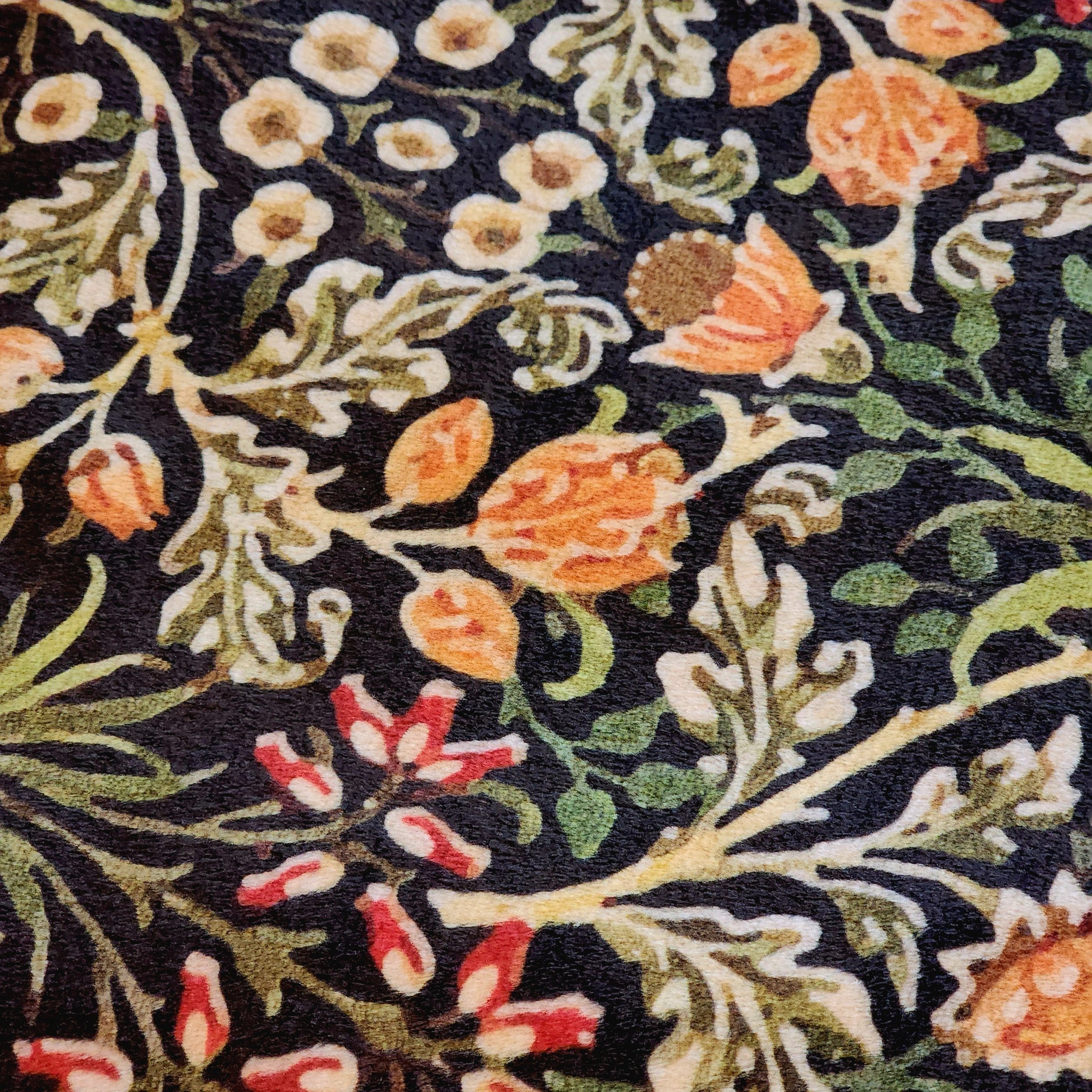 • William Morris’ design features varying sunset oranges, greens, ebony, and gold, with a touch of sage